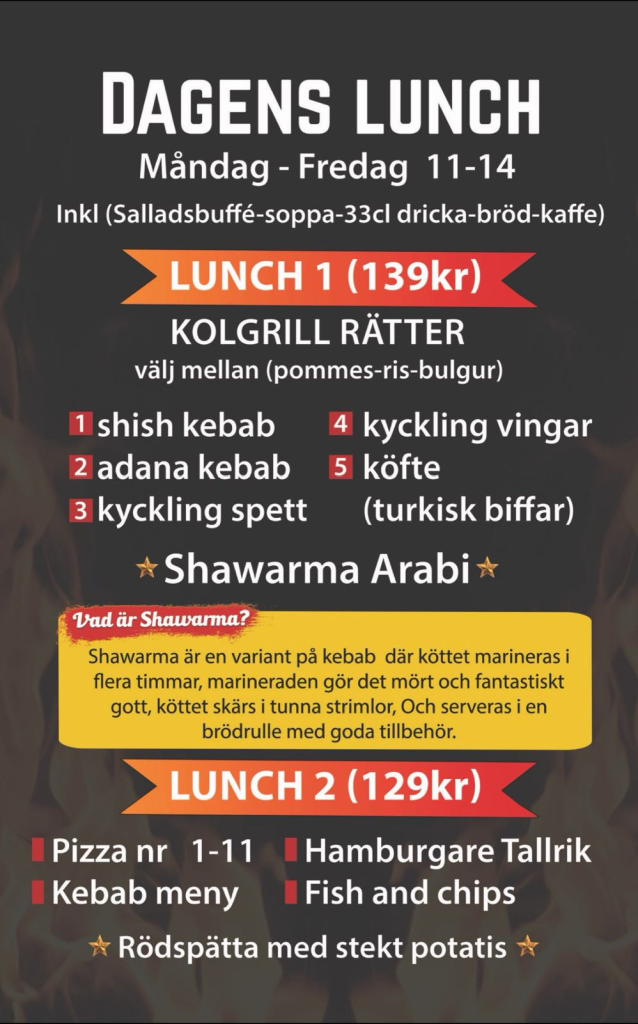 Hos oss börjar allt med noggrant utvalda råvaror. Vi använder färska grönsaker, kvalitetskött och nybakat bröd som lyfter smakerna i varje rätt. All mat tillagas med omsorg för att ge en god och mättande måltid.